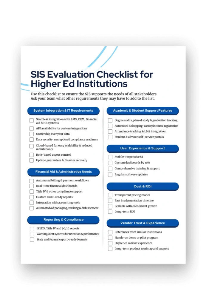 For finance leaders evaluating student information systems, the goal is clear: reduce manual work, increase visibility and cut unnecessary costs. Here’s how legacy systems fall short and what modern SIS software should deliver.